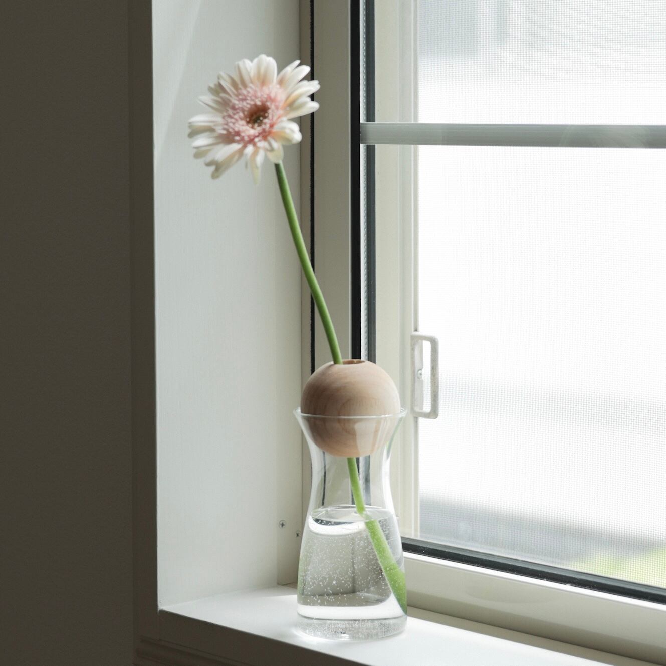 木のボールとガラスの組み合わせがユニークな一輪挿し。