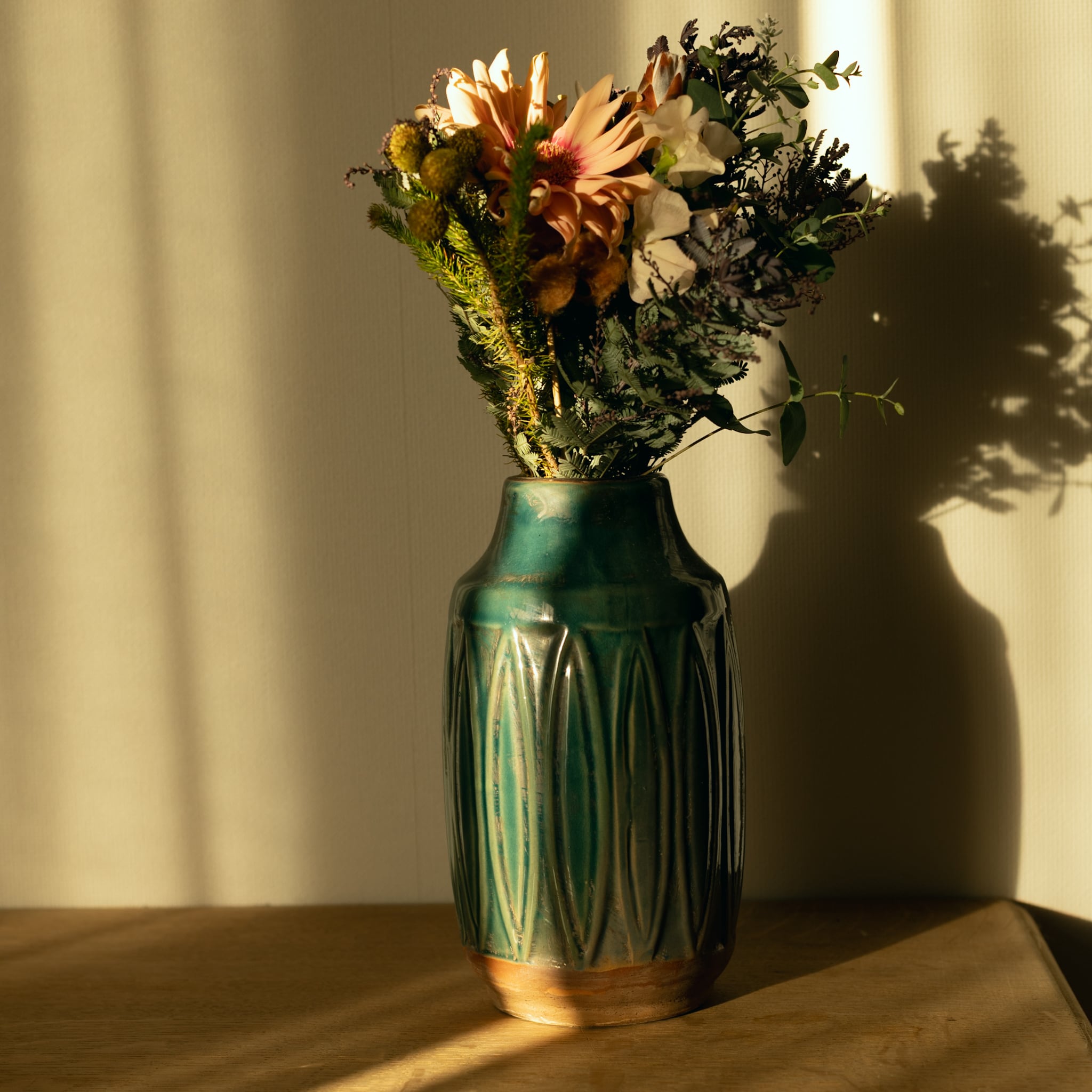 どこか土のぬくもりを感じる佇まいは、お花を挿さなくても絵になる存在。