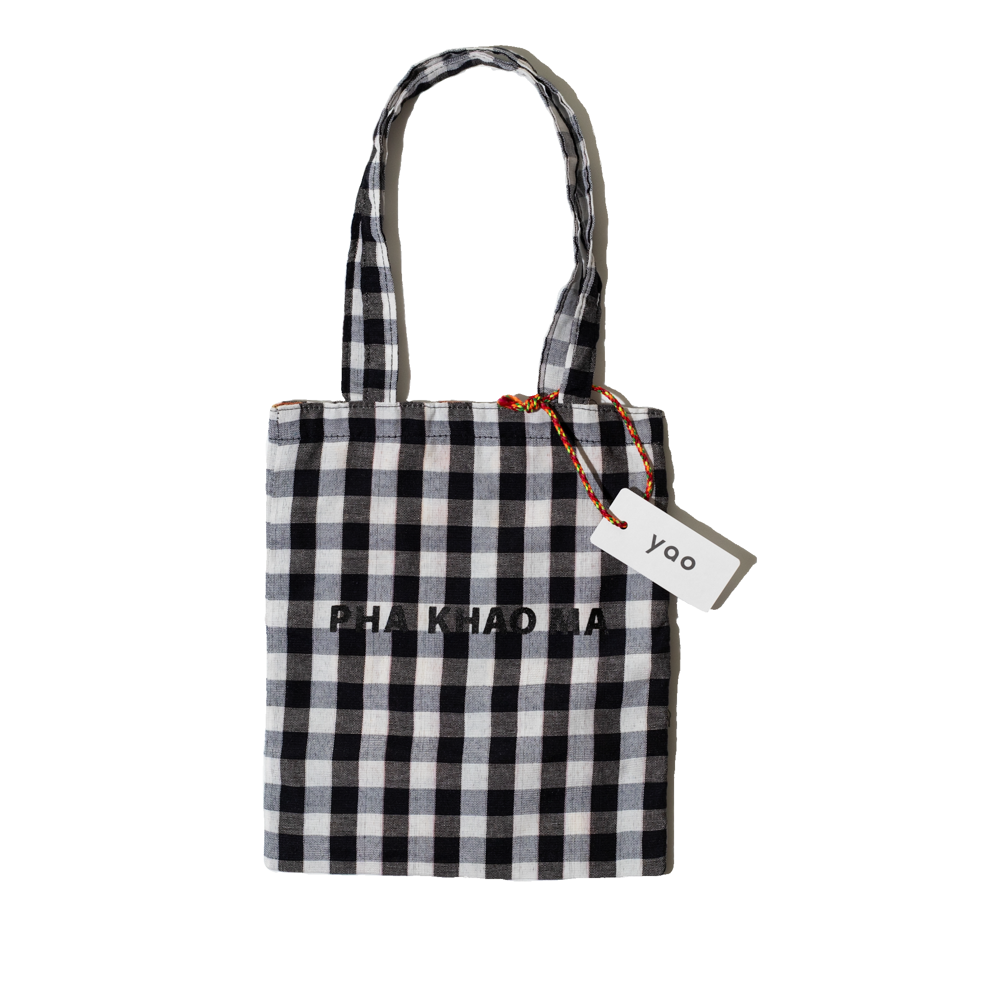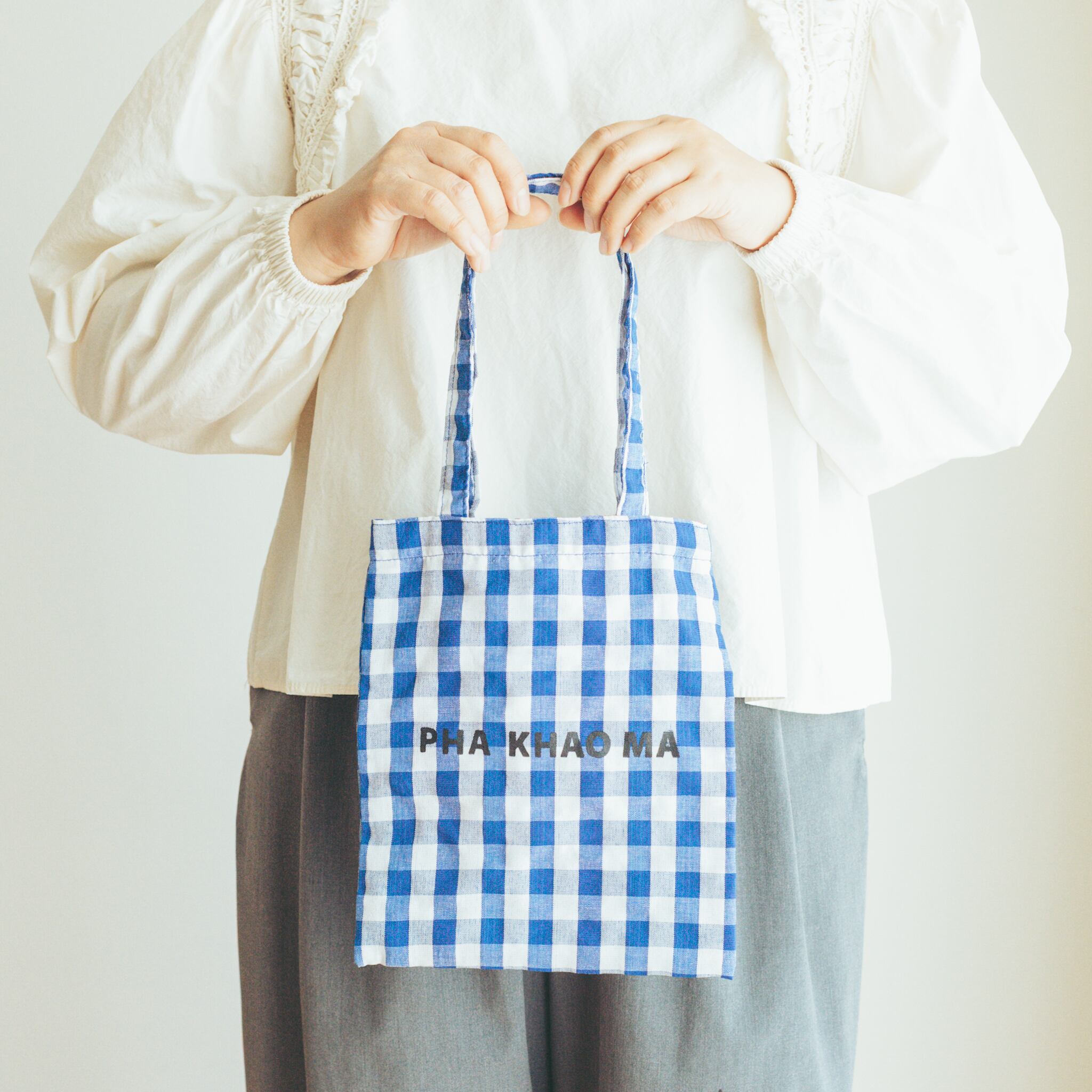 タイの伝統布「パーカオマー(pha khao ma)」を使用した、素朴であたたかみのあるミニバッグ。
