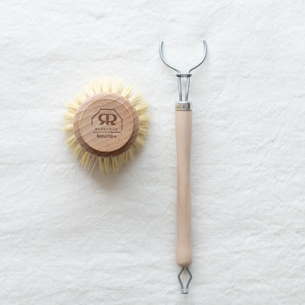 ウォッシングブラシ(鍋・フライパン用)はヤシを使用しているので丈夫で、頑固な汚れも落としてくれます。持ち手はウッド素材で手になじみます。また、持ち手とブラシ部分を取り外して使用することもできるので、気になる汚れは持ち手を外してタワシのように使用してください。